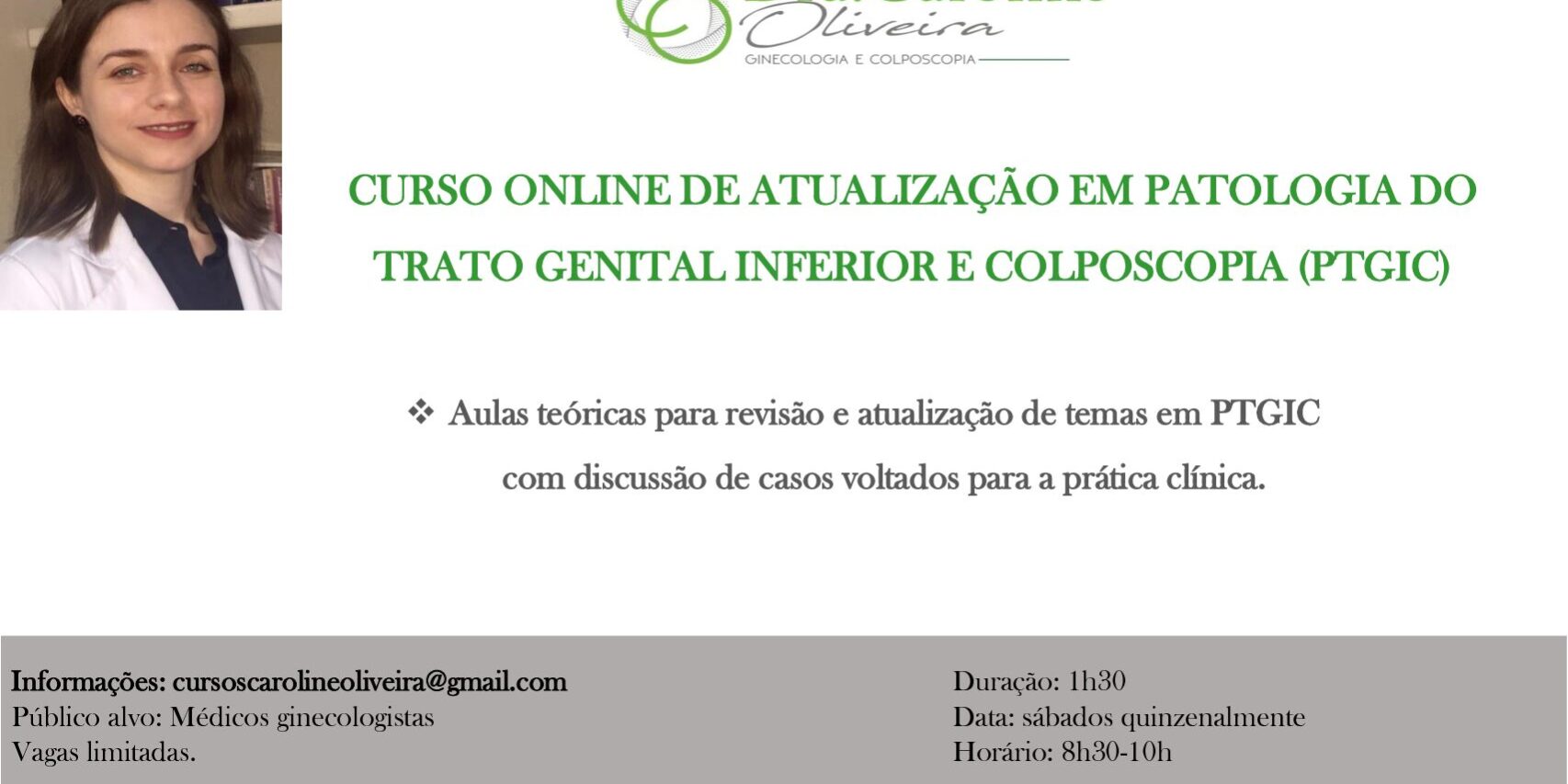 7 ENCONTROS AOS SÁBADOS A PARTIR DE 26/6/21 DE 8H30 – 10H PARA REVISÃO E ATUALIZAÇÃO NOS PRINCIPAIS TEMAIS EM PATOLOGIA DO TRATO GENITAL INFERIOR E COLPOSCOPIA. INSCRIÇÕES: CURSOSCAROLINEOLIVEIRA@GMAIL.COM.