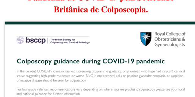 - Pacientes com sintomas de COVID-19 devem aguardar ficarem assintomáticas ou com teste negativo para que seja realizada colposcopia.